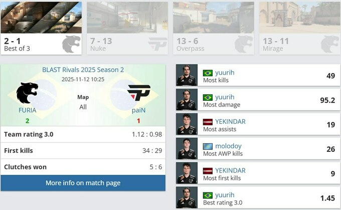 Бразильская команда FURIA одержала напряженную победу над своим соотечественником, командой paiN, со счетом 2:1 (Nuke 7:13, Overpass 13:6, Mirage 13:11) и вышла в плей-офф BLAST Rivals по CS2.