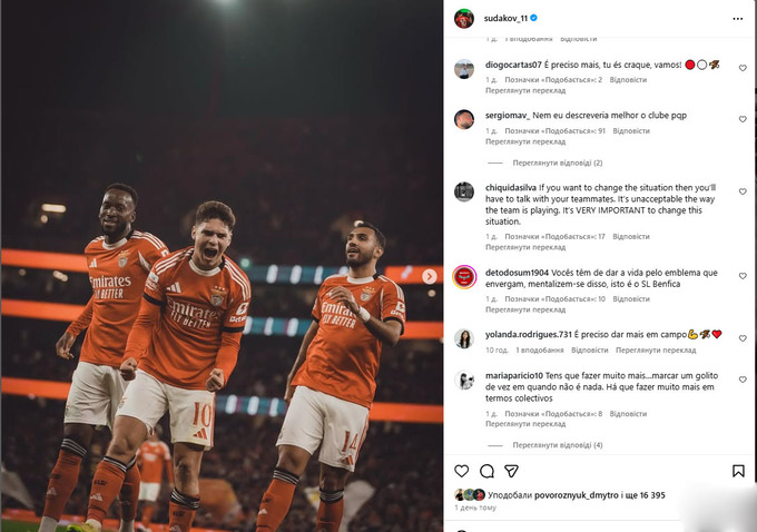 Полузащитник сборной Украины Георгий Судаков оказался под волной критики от фанатов «Бенфики» после новой публикации в своем Instagram.