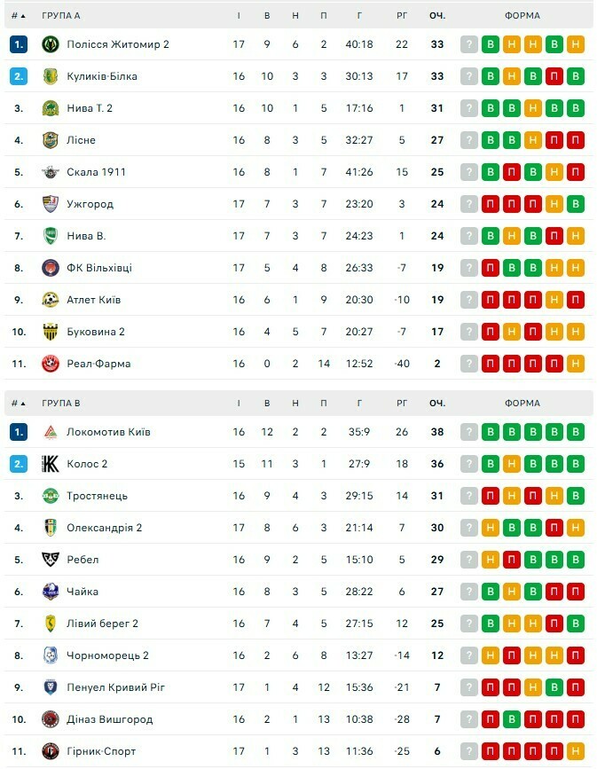 Лидируют в турнире: группа A – «Полесье-2» и «Куликов-Билка» (по 33 очка), группа B – «Локомотив» Киев (38) и «Колос-2» (36).