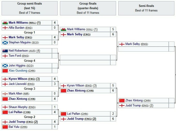 13 ноября в последней группе Нил Робертсон сыграет с Томом Фордом в стартовом матче, после чего Джон Хиггинс встретится с Сяо Гоудуном. Победители этих двух матчей сразу после этого определят последнего полуфиналиста.