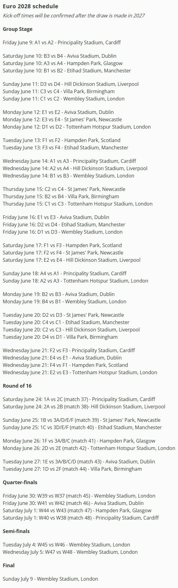 The tournament schedule for UEFA #EURO2028 has been confirmed! ⬇️