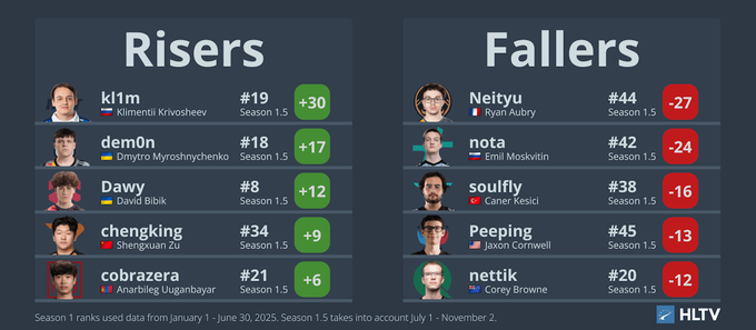 В то же время некоторые игроки потеряли позиции – Иван «zweih» Гогин, Кори «nettik» Браун и Джексон «Peeping» Корнуэлл не смогли адаптироваться в новых коллективах. А низкая результативность сказалась на Райане «Neityu» Обри и Эмиле «nota» Москвитине, которые уступили места в рейтинге конкурентам.