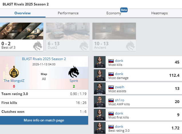 Spirit уверенно обыграли The MongolZ со счетом 2:0, взяв реванш за поражение на IEM Chengdu. Подопечные Леонида «chopper» Вишнякова доминировали на Dust2 (13:6), где Данил «donk» Крышковец показал рейтинг 2.73 на стороне защиты. На Ancient матч получился напряженнее – The MongolZ дважды сравнивали счет, но благодаря квадрокиллу donk Spirit выиграли решающие раунды и закрыли карту 13:10.