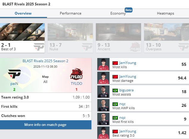 В параллельном поединке paiN выбили TYLOO с турнира, обыграв китайскую команду со счетом 2:1 (Nuke 13:6, Ancient 8:13, Overpass 13:10).