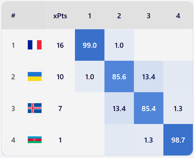 Турнирное положение: 1. Франция (10 очков), 2. Украина (7), 3. Исландия (4), 4. Азербайджан (1).