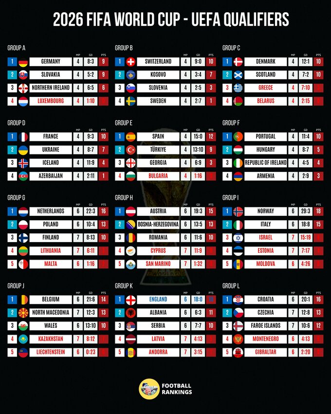 Победители групп получат путевки на ЧМ-2026. Команды, занявшие вторые места, будут играть в плей-офф (в марте 2026 года).