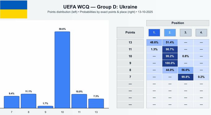Эксперты оценивают как наиболее вероятный сценарий (более 85%), при котором Украина займет второе место в группе. Для этого сине-желтым нужно будет достичь позитивного результата в заключительном матче группы против Исландии.