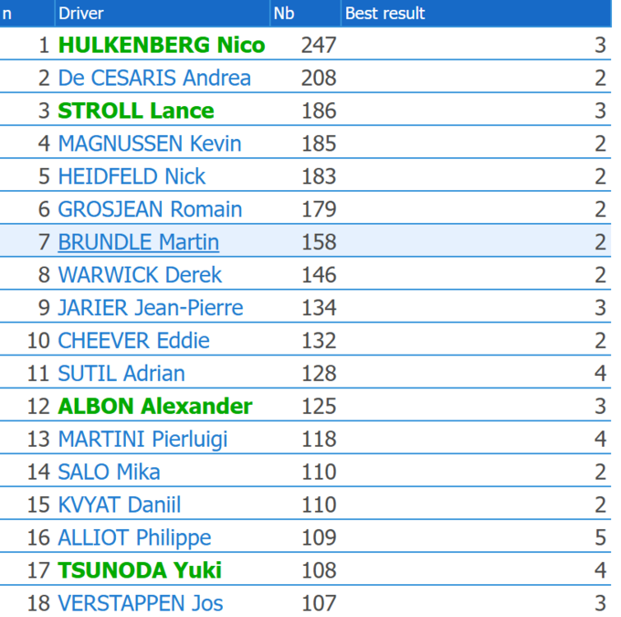 Первое место в этом рейтинге занимает Нико Хюлькенберг с 247 стартами без побед, второе – Андреа де Чезарис (208).