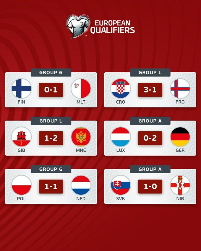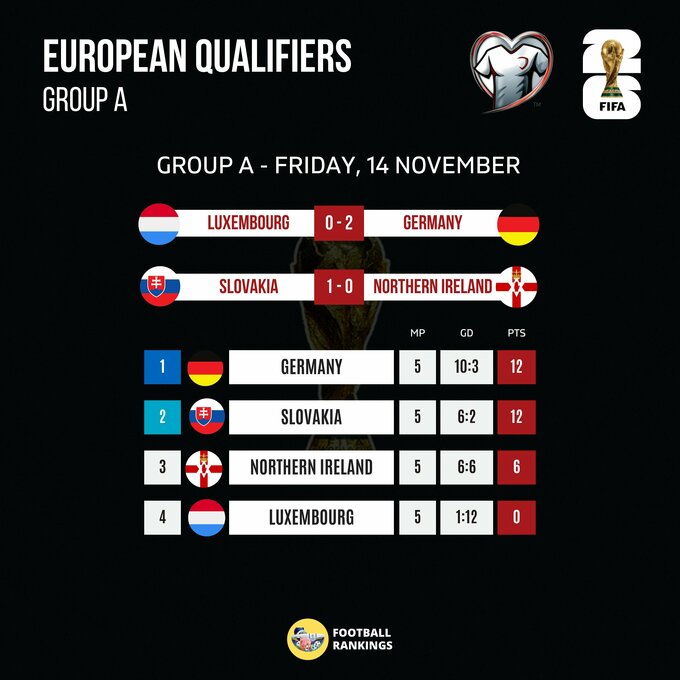 Германия на выезде одержала победу над Люксембургом со счетом 2:0. Словакия на своем поле обыграла Северную Ирландию (1:0).
