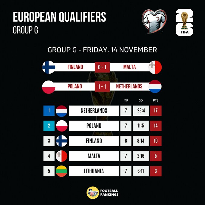 Нидерланды (17) опережают Польшу (14) на три очка и имеют гораздо лучшую разницу мячей, поэтому практически наверняка оформят выход на ЧМ в игре с Литвой (17 ноября).