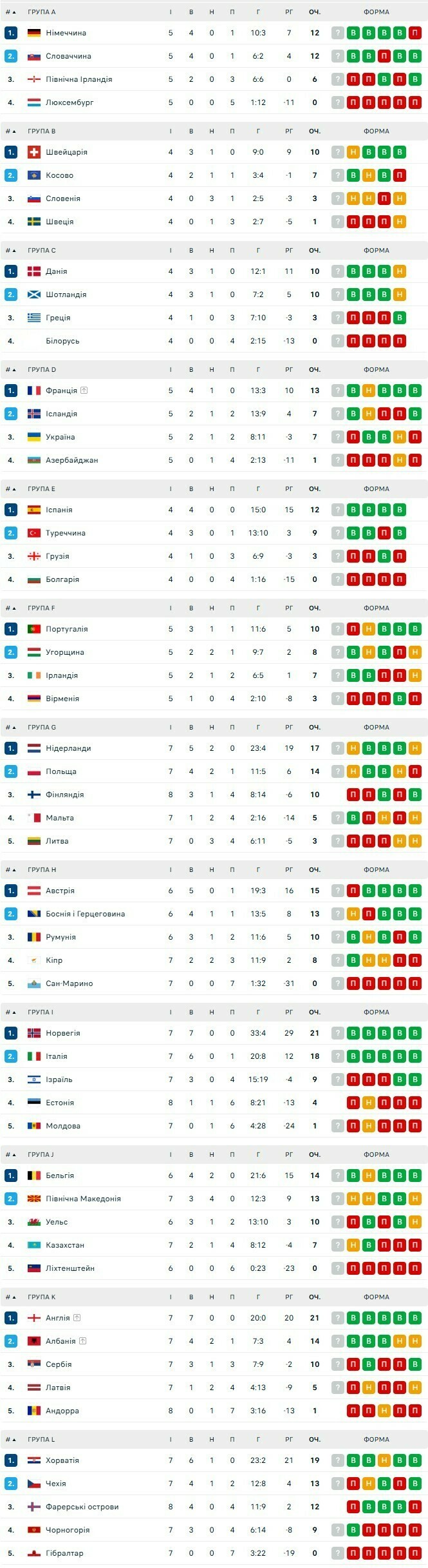 Северная Ирландия (6 очков), хоть и заняла лишь третье место, но сыграет в плей-офф благодаря успешному выступлению в Лиге наций.