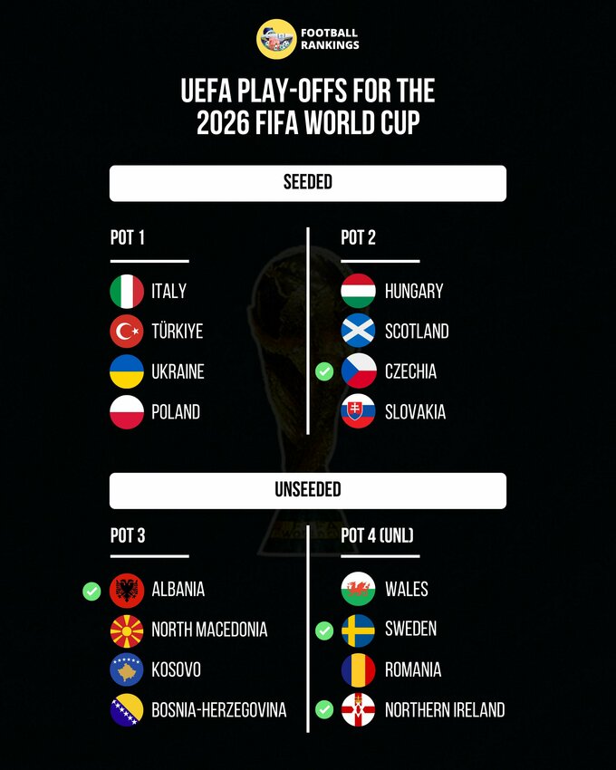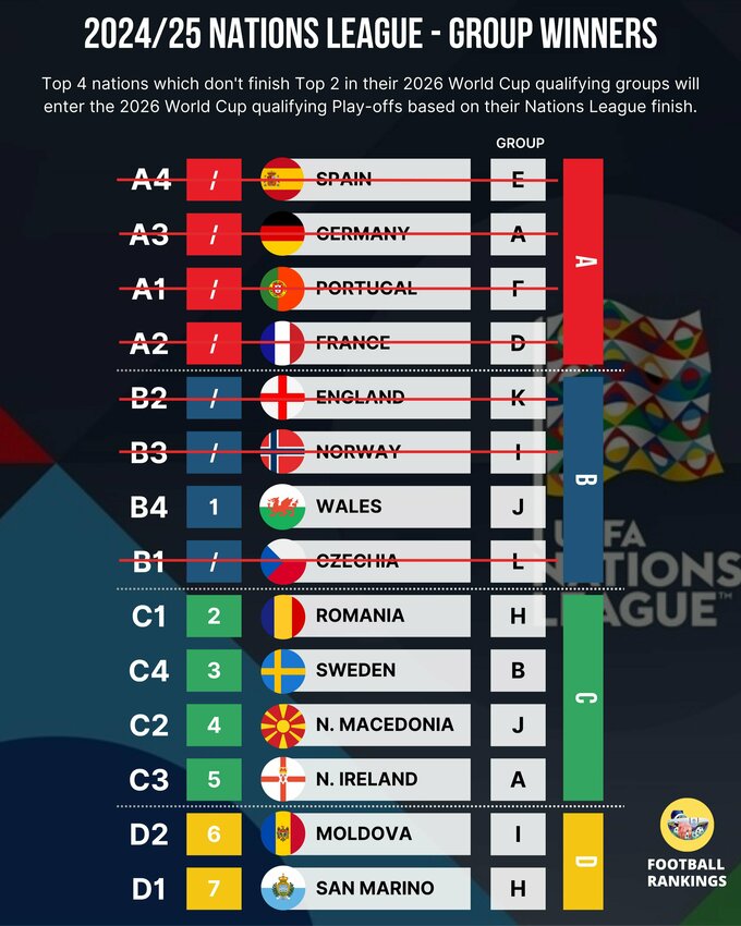Победители групп получат путевки на ЧМ-2026. Команды, занявшие вторые места, будут играть в плей-офф (в марте 2026 года).