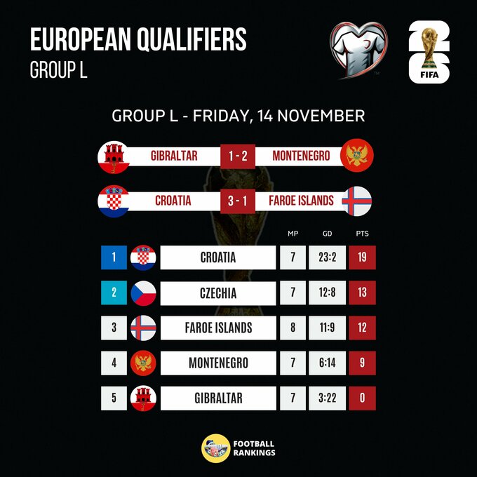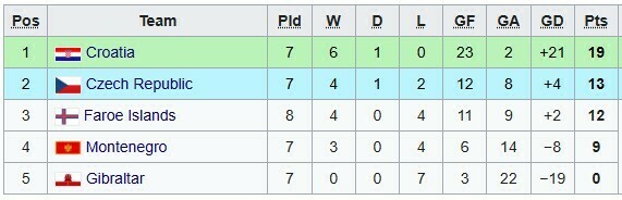 Турнирное положение: Хорватия (19 очков), Чехия (13), Фареры (12), Черногория (9), Гибралтар (0).
