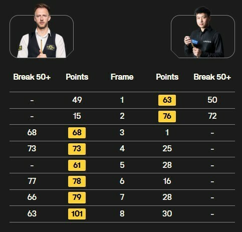 Китаец Чжао Синьтун выиграл первые два фрейма благодаря брейкам 50 и 72, но Трамп взял следующие пять партий, сделав серии 68, 73, 77 и 66. Счет стал 5:2. В восьмом фрейме англичанин первым получил шанс, набрал 38 очков и промахнулся по красному в центральную лузу, но контратака Чжао завершилась на 30. Китаец не забил сложный красный в верхний угол. На этом его шансы угасли, а Трамп оформил победу брейком в 63 очка (6:2).