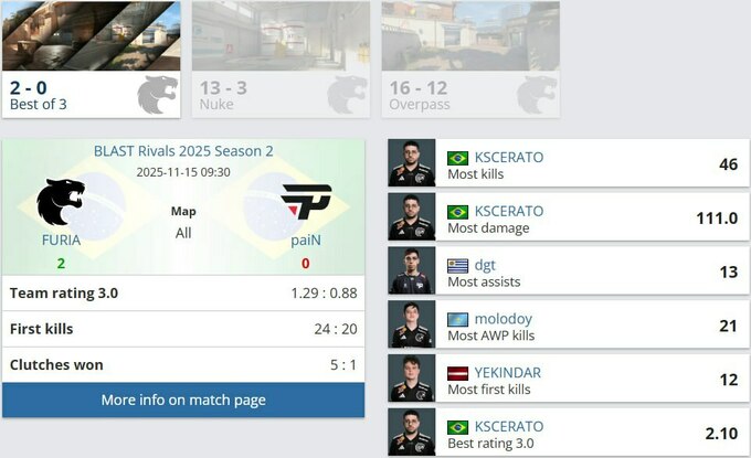 FURIA первыми пробились в гранд-финал BLAST Rivals 2025 Season 2, обыграв paiN со счетом 2:0 (Nuke 13:3, Overpass 16:12). Героем встречи стал Каики «KSCERATO» Серату, который показал феноменальный рейтинг 2.10, 111 ADR и +11.79 round swing – один из лучших перформансов года.