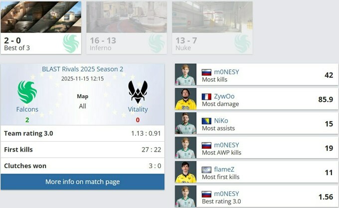 Falcons вышли в гранд-финал BLAST Rivals Season 2, одержав тяжелую победу над Vitality со счетом 2:0. В матче за титул команда встретится с FURIA – соперником, которому проиграла три последние очные серии.