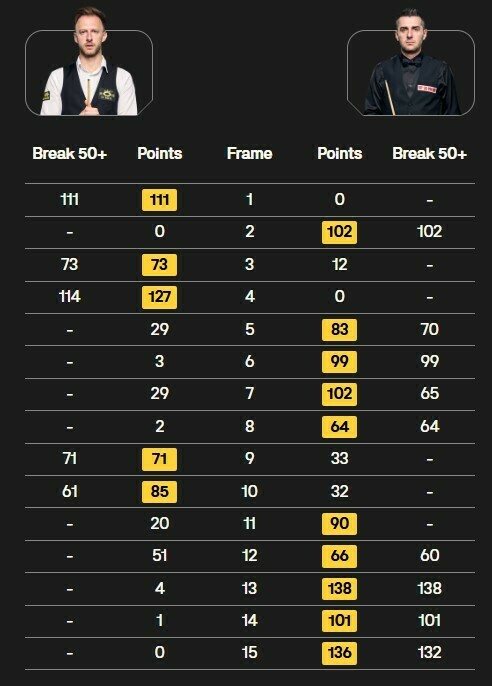 Джадд Трамп, который все еще остается без титула в 2025 году, имел преимущество 3:1 благодаря брейкам 111, 73 и 114, несмотря на то что Селби сделал 102 во втором фрейме. Затем Селби ответил брейками 70, 99, 65 и 64, выйдя вперед (5:3). Брейк Трампа в 71 очко принес ему последний фрейм дневной сессии (4:5).