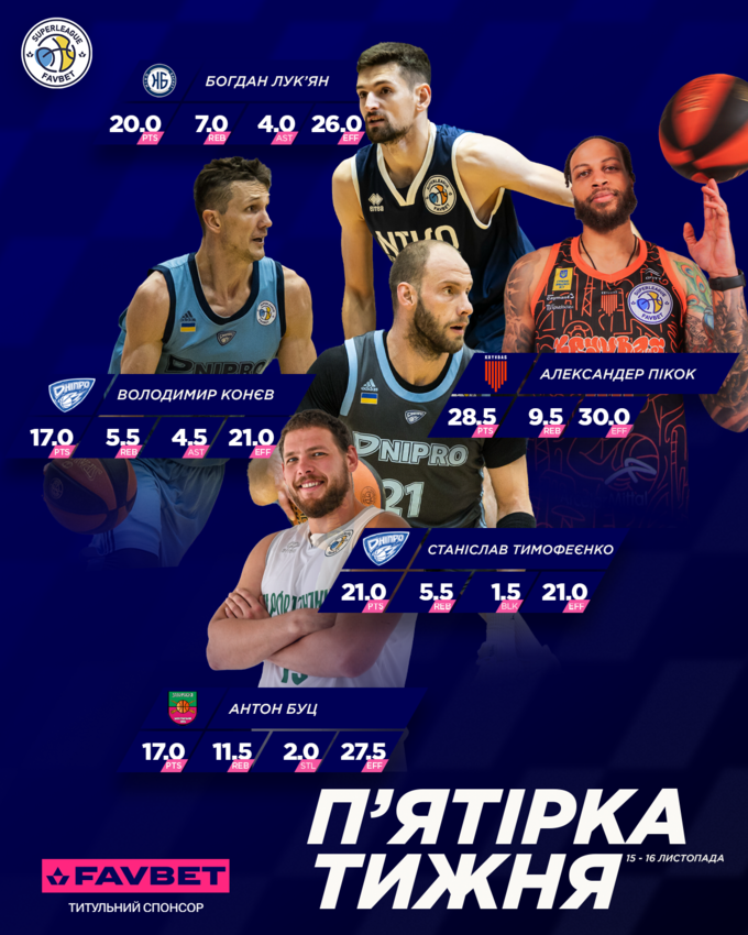 - Богдан Лукьян (Нико-Баскет, 1 матч) – 20 очков, 7 подборов, 4 передачи (РЭ 26)