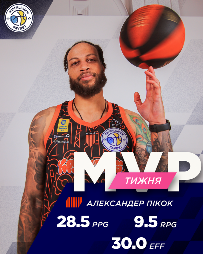 MVP шестого тура признан американский защитник «Кривбасса» Александр Пикок, который стал лучшим игроком команды в двух выигранных матчах против «Киев-Баскета» (24 очка, 9 подборов, 2 перехвата, 2 блок-шота) и «Ровного» (33 очка, 10 подборов). В обоих матчах рейтинг эффективности Пикока достиг 30 баллов. Легионер помог своей команде продолжить победную серию в чемпионате до пяти матчей – это на данный момент лучшая активная серия в Суперлиге.