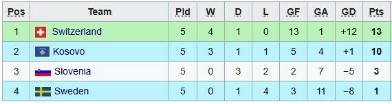 Швейцария имеет на три очка больше Косова (13 очков против 10) и значительное преимущество по разнице мячей (+12 против +1).