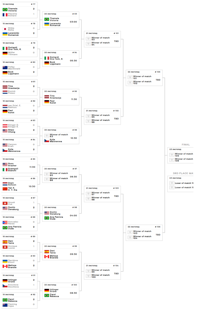 Таким образом, украинки впервые в истории пробились в 1/8 финала. Там они встретятся с лидерами мирового рейтинга – бразильским дуэтом Тамела Галил / Виктория Лопес. Матч пройдет 20 ноября в 05:00 по киевскому времени.