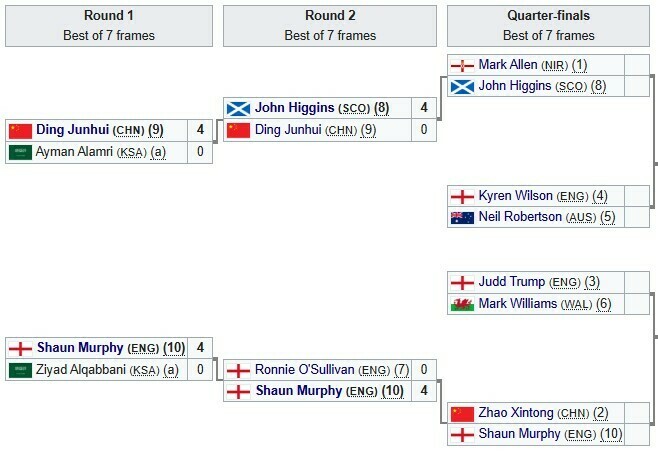 Один из лучших игроков сезона Шон Мерфи, победитель British Open и финалист Гран-при Сианя, находится в отличной форме. Сначала он обыграл саудовского уайлдкард-игрока Зияда Алькаббани (4:0) с брейками 128 и 109. Его дальние удары были безупречными и во втором раунде, тогда как О'Салливан заметно уступал в игровом тонусе.