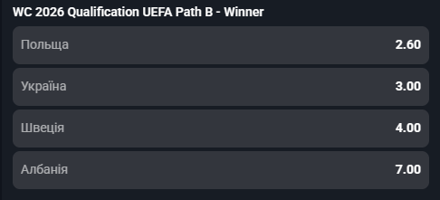 Букмекерские конторы выставили коэффициенты на победителя Пути B. Наибольшие шансы имеет польская команда – 2.60. Коэффициент на выход Украины на мундиаль составляет 3.00.