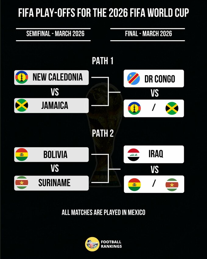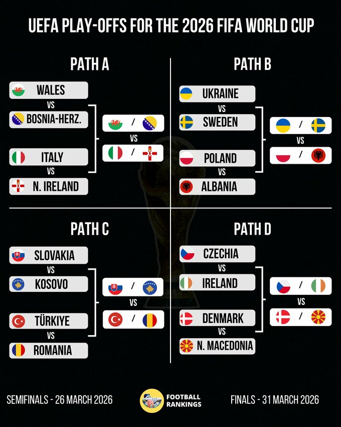 Матчи плей-офф состоятся в марте, а победители четырех путей получат путевки на чемпионат мира 2026.