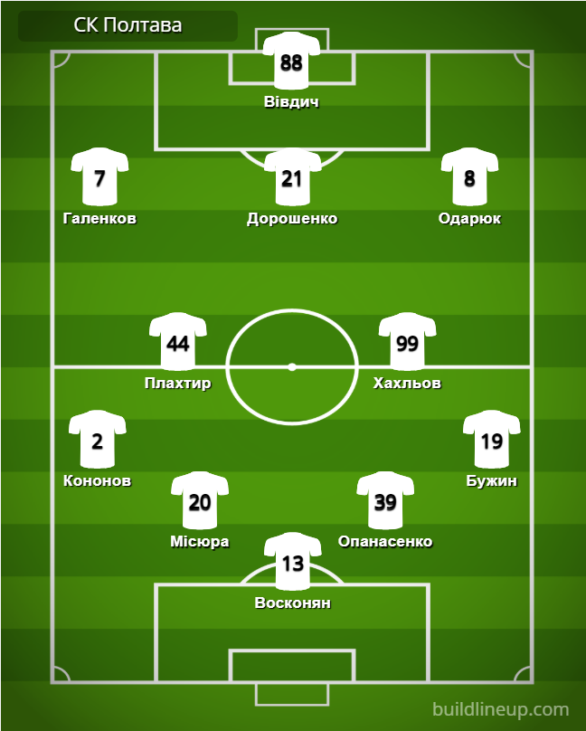 СК «Полтава»: Восконян – Кононов, Мисюра, Опанасенко (Савенков, 23), Бужин – Плахтырь (Даниленко, 66), Хахлев (Стрельцов, 66) – Галенков (Онищенко, 90+2), Дорошенко, Одарюк (Коцюмака, 90+2) – Вивдыч.
