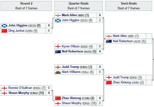 В полуфиналах 21 ноября сыграют: Марк Аллен (Северная Ирландия) – Нил Робертсон (Австралия), Джадд Трамп (Англия) – Чжао Синьтун (Китай).