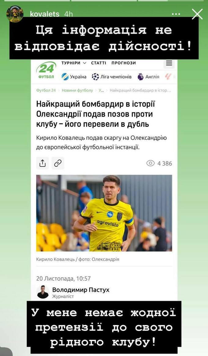 Полузащитник и капитан «Александрии» Кирилл Ковалец подал запрос в европейский футбольный суд из-за перевода в состав дубля, сообщает издание Футбол 24.