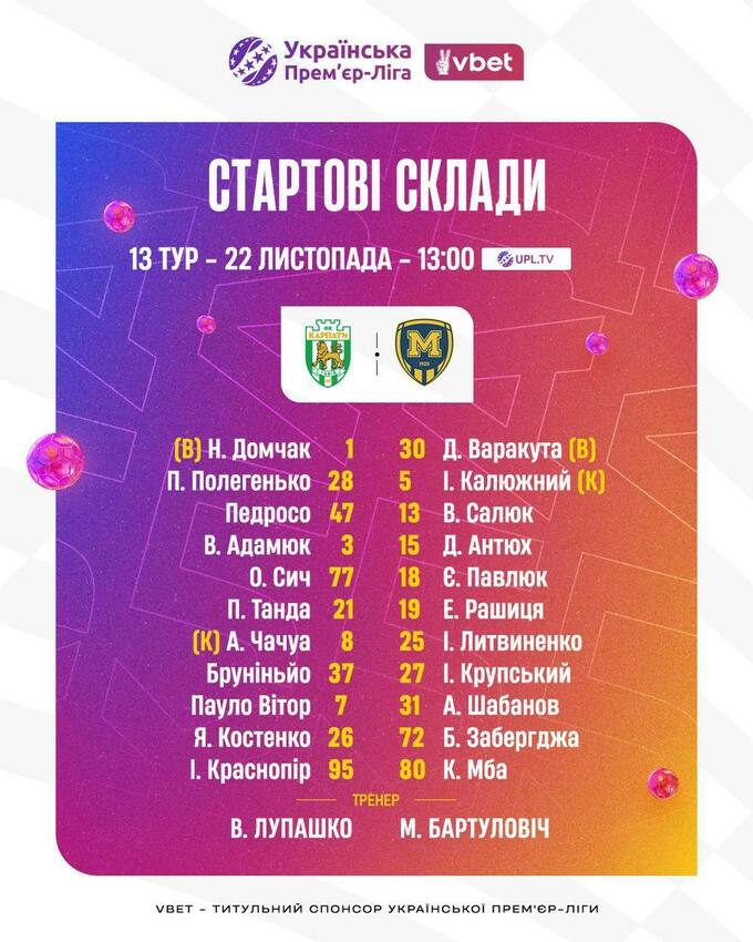 В матче 13-го тура Украинской Премьер-лиги 2025/26, который состоится 22 ноября, сыграют львовские «Карпаты» и харьковский «Металлист 1925».