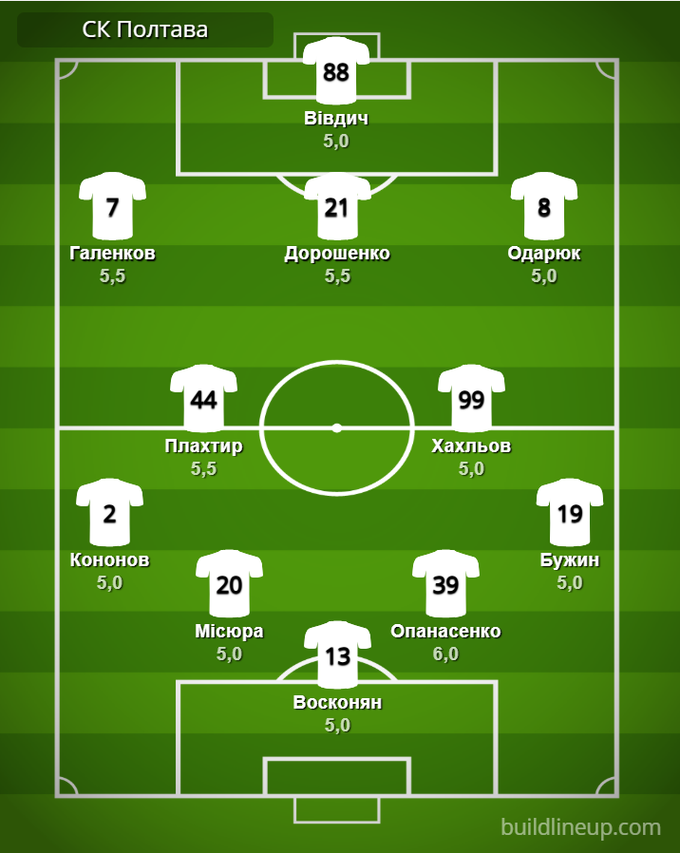 СК «Полтава»: Восконян – Кононов, Мисюра, Опанасенко (Савенков, 23), Бужин – Плахтырь (Даниленко, 66), Хахлев (Стрельцов, 66) – Галенков (Онищенко, 90+2), Дорошенко, Одарюк (Коцюмака, 90+2) – Вивдыч.