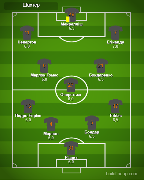 «Шахтер»: Ризнык – Педро Энрике, Марлон (Матвиенко, 70), Бондарь, Тобиас – Марлон Гомес (Крыськив, 70), Очеретько, Бондаренко – Невертон (Изаки, 61), Мейреллиш (Кауан Элиас, 61), Эгиналду (Феррейра, 80)
