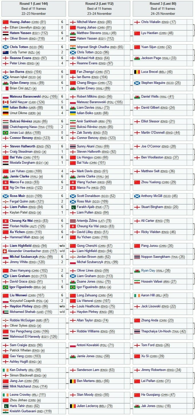 Квалификация проходит с 22 до 27 ноября в английском Уигане, а рейтинговый турнир состоится в английском Йорке с 29 ноября до 7 декабря.