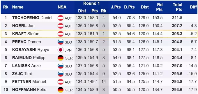 С отставанием в 4.3 балла вторым финишировал еще один австриец – Ян Херль, а тройку лучших замкнул другой представитель Австрии – Штефан Крафт.