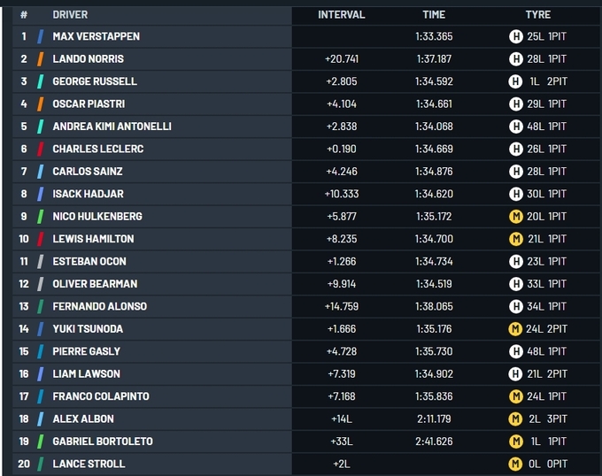Стоит выделить неплохую гонку Льюиса Хэмилтона и невероятный прорыв Андреа Кими Антонелли. Пилот Феррари стартовал 20-м, быстро отыграл шесть позиций и в итоге сумел заехать в очки, а гонщик Мерседеса с 17-й позиции со штрафом в пять секунд финишировал пятым.