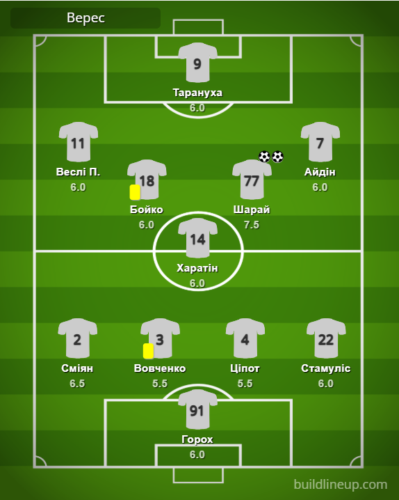 «Верес»: Горох — Смиян, Вовченко (Гончаренко, 46), Ципот, Стамулис — Харатин (Клёц, 78) — Весли П. (Годя, 78), Бойко, Шарай (Куция, 90+1), Айдын — Тарануха (Пушкуца, 87).