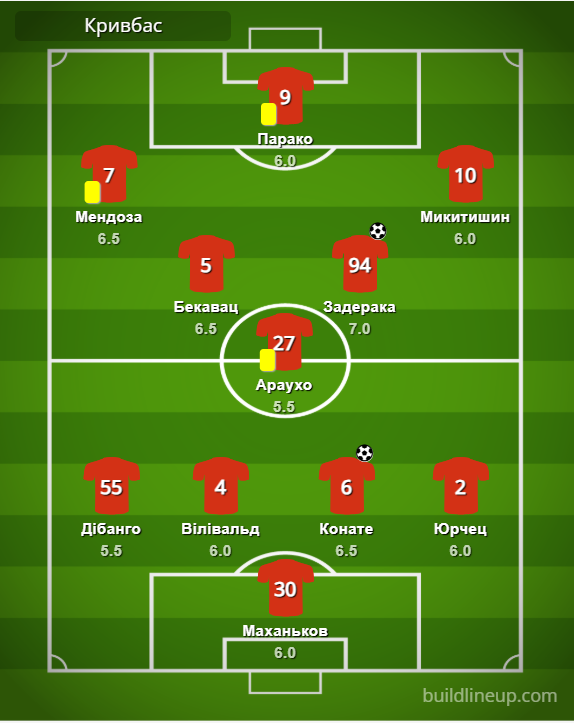 «Кривбасс»: Маханьков — Дибанго, Виливальд, Конате, Юрчец — Араухо — Бекавац (Шевченко, 60), Задерака — Мендоза (Каменский, 89), Парако (Мулик, 75), Микитишин (Майя, 89).