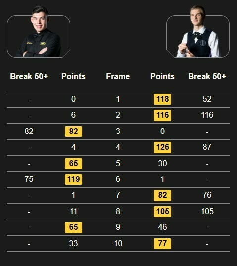 20-летний Юлиан Бойко в Q2 обыграл 19-летнего Лиама Дэвиса из Уэльса со счетом 6:4. Украинец оформил два сенчури-брейка (116, 105).