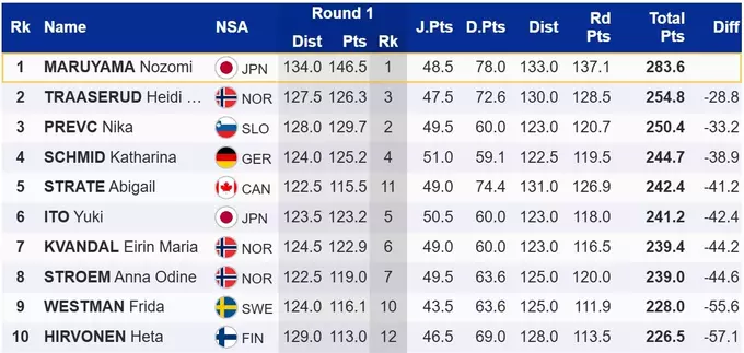 Вторую подряд личную победу в начале сезона одержала японка Нозоми Маруяма, показав довольно уверенный результат: 283.6 балла.