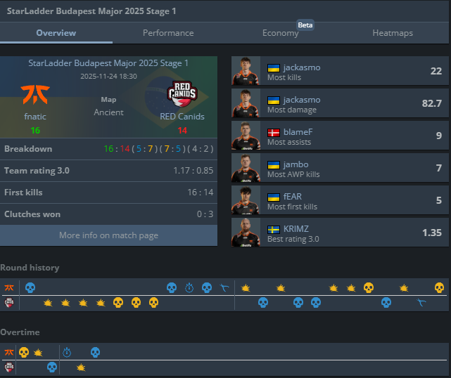 Украинцы из fnatic одержали непростую победу над бразильской командой Red Canids в своем дебютном матче на Budapest Major 2025. Поединок в формате Bo1 прошел на карте Ancient и завершился со счетом 16:14 в пользу fnatic после овертайма.