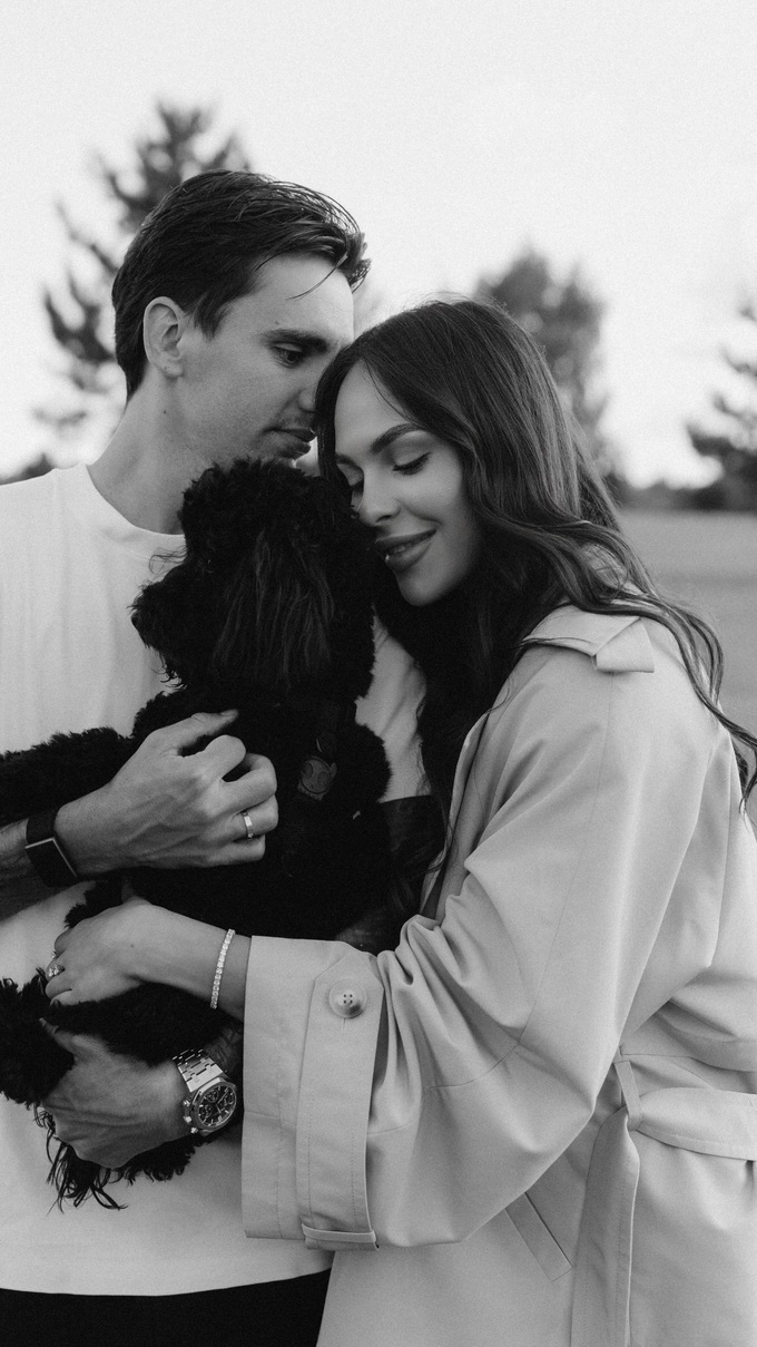 Пара нежно обнимается, держа на руках своего пса – кадр получился максимально теплым и романтичным.