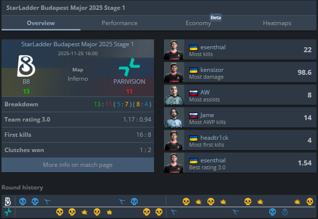 Украинский клуб B8 Esports сегодня одержал вторую победу на Budapest Major 2025, обыграв российский состав PVISION со счетом 13:11 в формате Bo1 на карте Inferno.