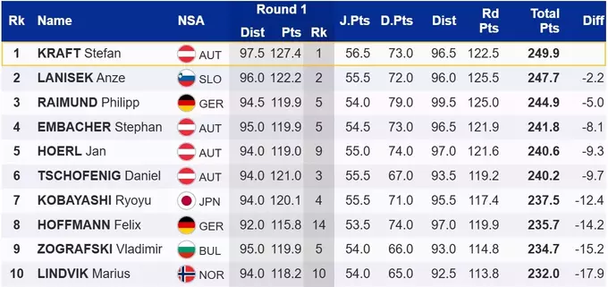 Победителем на трамплине HS95 стал австриец Стефан Крафт, который набрал 249,9 балла и опередил второе место на 2.2 пункта.