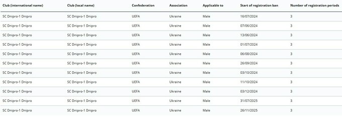 Известный украинский клуб «Днепр-1» получил очередной трансферный бан от ФИФА. Информация о санкциях Международной федерации футбола появилась в официальном списке команд, которым запрещено регистрировать новых футболистов.