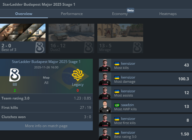 B8 устроили настоящий ад в матче против бразильского состава Legacy, одержав победу с сухим счетом 2:0 и пробившись во второй этап Budapest Major 2025. Украинцы вырвали победу на Dust2 в овертайме, а Mirage забрали уверенно и без лишних нервов.
