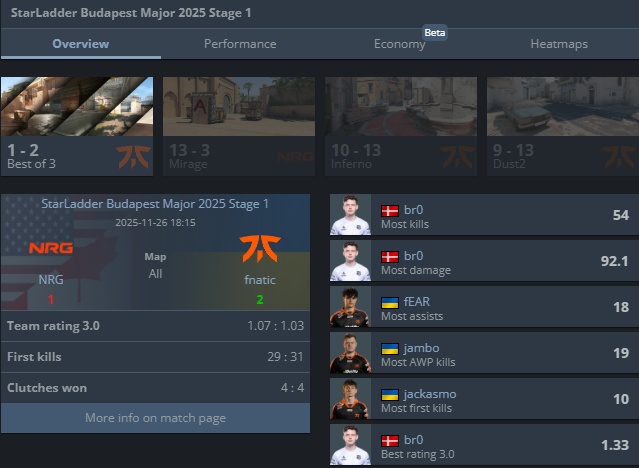 Однако в самый важный момент fnatic нашли ответ. Jackasmo, закончивший Dust2 с рейтингом 1.64, постоянно ломал атаки соперника, а кульминацией стал решающий клатч 1v2 от капитана Родіона «fEAR» Смыка, поставившего точку в серии. Fnatic завершили матч победой 13:8 и выиграли серию 2:1.