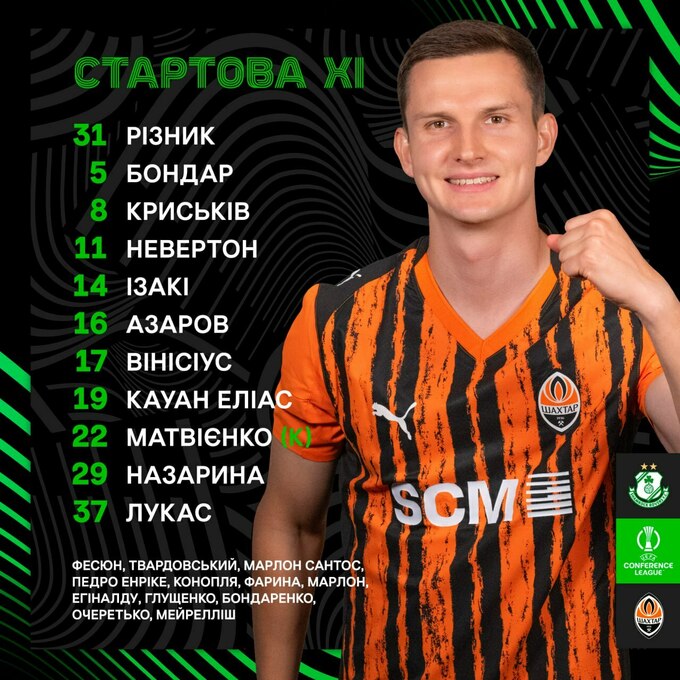 Шахтер: Ризнык, Бондарь, Крыськив, Невертон, Изаки, Азаров, Винисиус, Кауан Элиас, Матвиенко, Назарина, Лукас