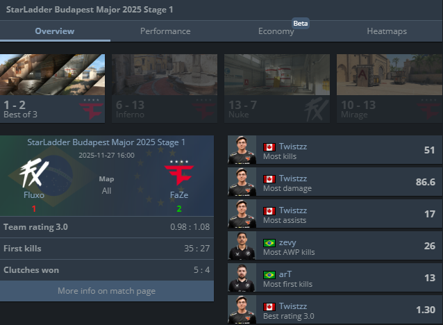 FaZe Clan избежали катастрофического вылета с Budapest Major, одержав тяжелую победу над Fluxo и пройдя во второй этап. Европейский состав выиграл на Inferno (13:6) и Mirage (13:10), уступив при этом на Nuke (7:13).